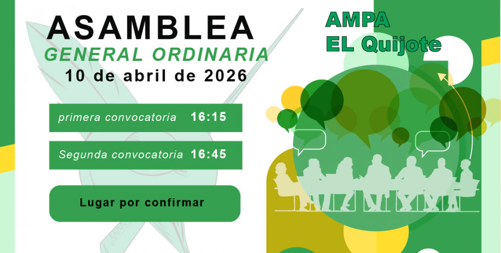 La junta directiva del AMPA CEIP El Quijote os convoca a la 1ª ASAMBLEA GENERAL ORDINARIA. Fecha: 10 de abril de 2026 Hora: 16:15 h en primera convoca. 16:45 h en segunda convocatoria. ORDEN DEL DÍA 1- Lectura y aprobación Acta Asamblea anterior, si procede.