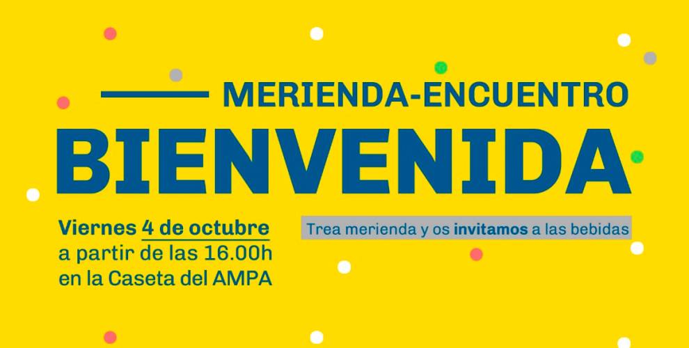 Dia 04 de octubre a partir de las 16:00 en la caseta del AMPA El viernes 4 de octubre a partir de las 16h haremos un ENCUENTRO DE BIENVENIDA a las familias del cole. Vente a merendar, jugar y conocernos. Traeros la merienda que nosotros